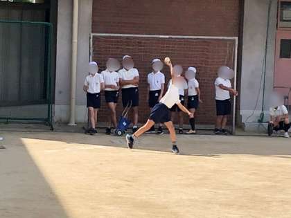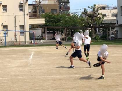 6年生の体育の様子です。体力テストのソフトボール投げの練習をしていました。最初にみんなで長い距離のキャッチボールをしてから一人一人がテストのコートで練習しました。