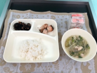 今日の献立は、鮭の胡麻味噌焼き、五目汁、ひじきの炒め煮、ご飯、牛乳です。いただきます。