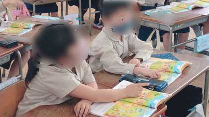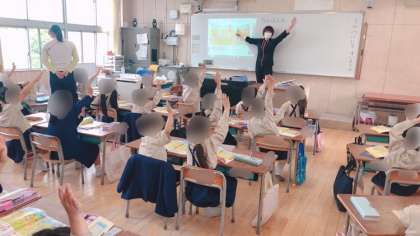1年生の様子です。算数で、教科書の挿絵を見ながら「りんごは右から5番目にあります。」って位置関係を表す学習をしていました。