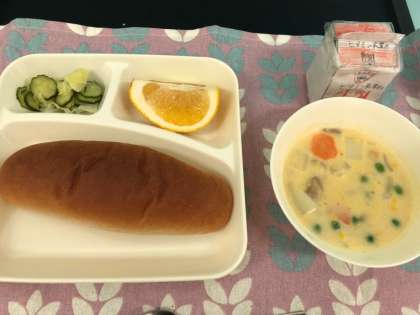 今日の献立は、コーンクリームシチュー、キャベツときゅうりのサラダ、河内ばんかん、黒糖パン、牛乳です。いただきます。