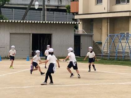 3年生の様子です。体育でしっぽとりおにをしていました。