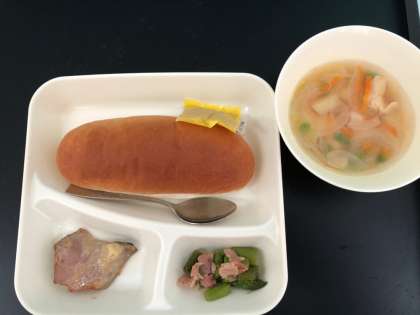 今日の献立は、カツオのガーリックマヨネーズ焼き、スープ、グリーンアスパラガスとベーコンのソテー、コッペパン、アプリコットジャム、牛乳です。美味しくいただきました。