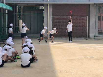 6年生の様子です。上段が1組、書写で「仲間」を書いていました。下段が2組、体力テストの50m走の記録を計測していました。