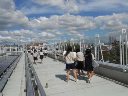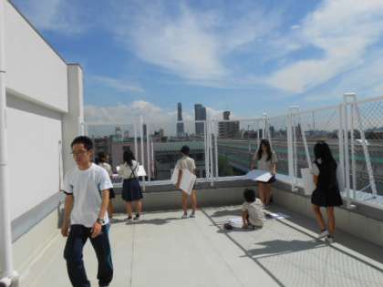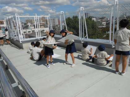 6年生の担任の先生が、屋上の出口の鍵を取りに来ました。「何をするのですか?」と聞くと「屋上で写生をします。」とのこと。そこで、こっそり屋上に様子を見に行きました。子どもたちは、屋上に上がって周りの景色を眺めています。何を描こうか迷っていました。クーラーの室外機や太陽光パネルを写生する子どもはいませんでした。