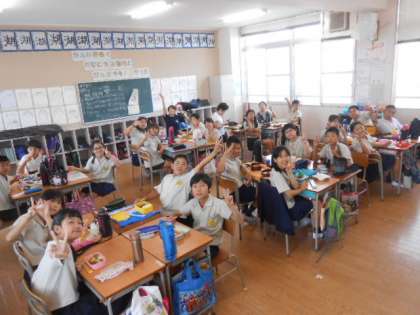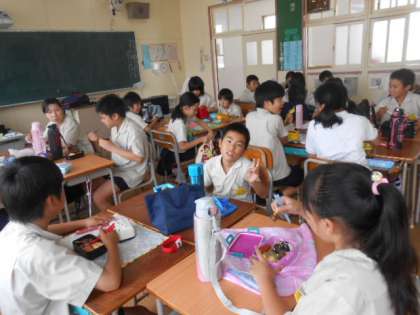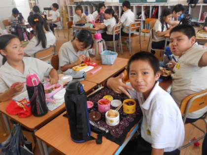 保護者の方に作っていただいたお弁当を美味しそうに食べる子どもたち。