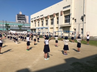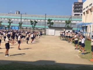 本校では、全校朝会の時に全員でラジオ体操をしています。朝から身体を動かし気持ちよく一日を過ごせるようにするためと、体力の向上を目指す目的があります。体育委員会が前で見本を見せながらします。