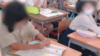 3年生の算数の様子です。白板に筆算の問題を写してみんなで先生と一緒に順番に解いていってました。