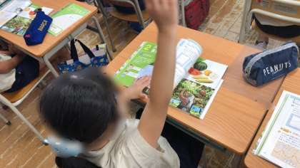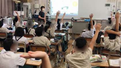 4年生の理科の様子です。映像を見ながら百葉箱について学習していました。先生の問いかけに一斉に手が挙がっていました。