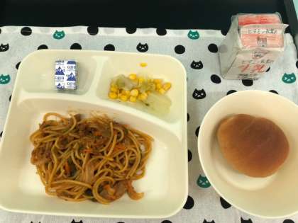 今日の献立は、カレースパゲッティ、レタスとコーンのサラダ、固形チーズ、黒糖ロールパン、牛乳です。いただきます。