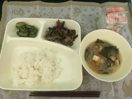 今日の献立は、プルコギ、豆腐とわかめのスープ、キュウリの甘酢漬け、ご飯、牛乳です。いただきます。
