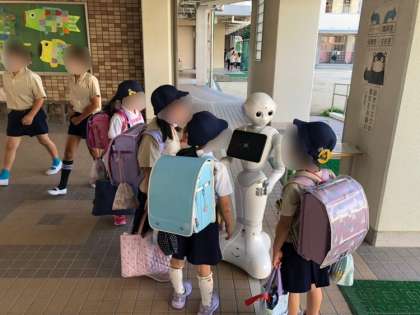朝は、正門エントランスでペッパーさんが子どもたちを出迎えてくれます。子どもたちと「おはよう」とあいさつを交わしています。