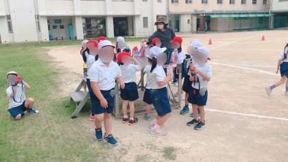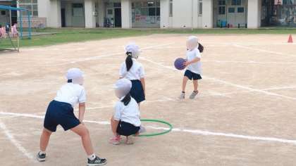 1年生の体育です。途中の障害物を飛び越えて走ったりボールを持って走ったり、2つのことを同時に行うことで運動能力を高めます。途中でしっかり水分を摂りながら進めます。