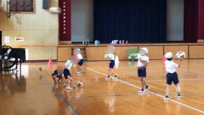 上段が1組、体育でボール投げの練習です。下段が2組、国語でプリントを使って学習していました。