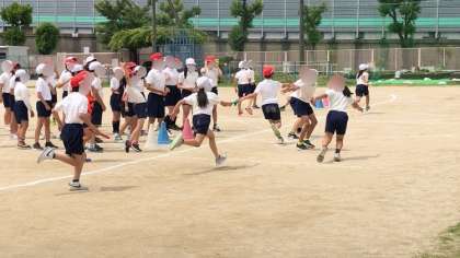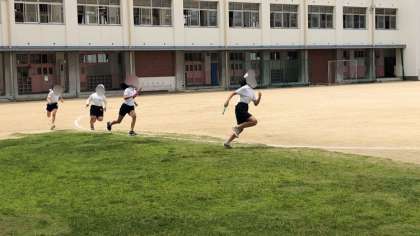 5年生の体育の様子です。1・2組合同でリレーをしていました。とても盛り上がっていました。