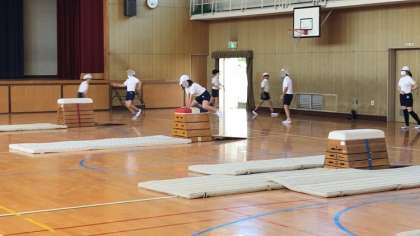 6年生の体育の様子です。跳び箱運動です。色んな場をつくって技の練習をしていました。