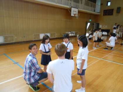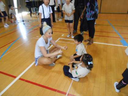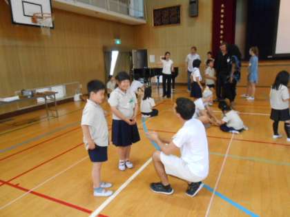 給食までのしばしの間、エスコート係は、英会話の練習です。