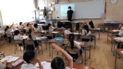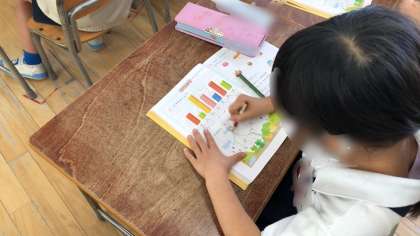 1年生の様子です。算数で、連続した数字を線で繋いで絵を完成させる繋ぎ絵で数字の学習をしていました。
