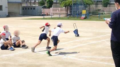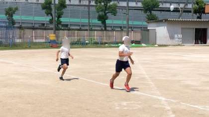 4年生の様子です。体育でトラック1周(約100m)のタイムを計測していました。