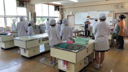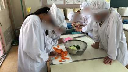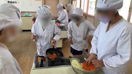 6年生は家庭科で調理実習をしていました。野菜の油炒めをつくっていました。熱が通りやすく切ったピーマンやにんじんなどをさっと炒めます。美味しくできそうですね。