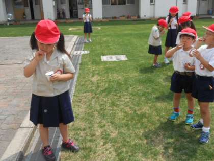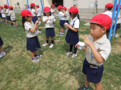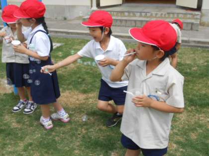 校庭の芝生の上でシャボン玉を飛ばしました。
