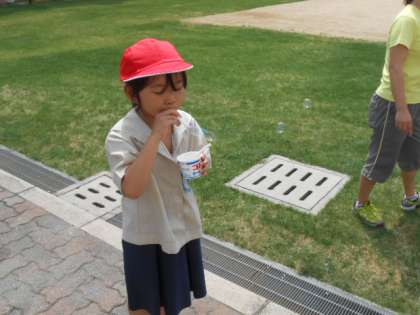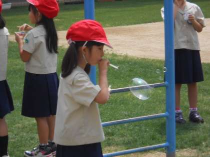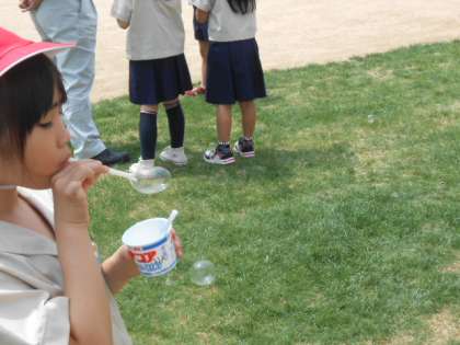 たくさんのシャボン玉を飛ばしてみたり、大きなシャボン玉を作ってみたりとおもいおもいにシャボン玉を飛ばす子どもたち。