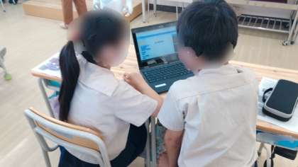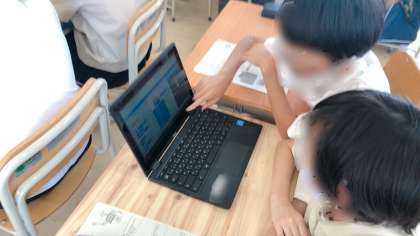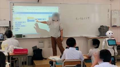 5年生が、区役所が主催のプログラミング学習出前授業を受けました。ソフトバンクの専門講師の方がペッパーさんを動かすプログラムの作成を通じてプログラミングを教えてくださいます。自分たちが思っているようにペッパーさんが動くよう2人で協力して頑張っていました。