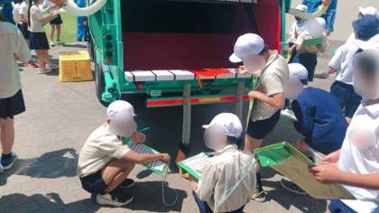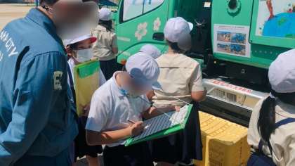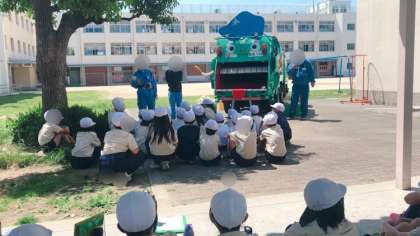 環境事業局の方々に来ていただいて廃棄物収集について教えていただきました。パッカー車に実際に触って色んな機能についても教えていただきました。