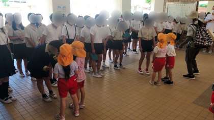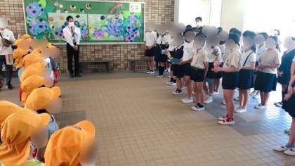 天使保育園の年長さんたちが学校に来てくれました。来年度1年生になるみなさんで、よろしくお願いしますの意味を込めて自分たちで育てたお花を花束にして持って来てくれました。5年生(年長さんたちが1年生になった時には6年生です)全員で受けとりました。