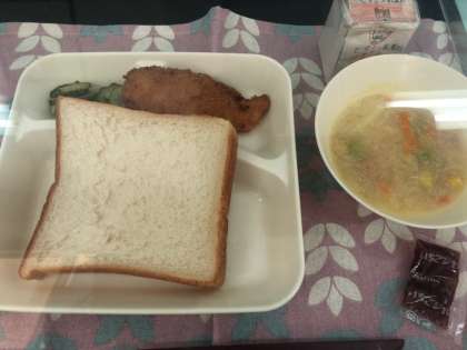 今日の献立は、サーモンフライ、豆乳スープ、きゅうりのバジル風味サラダ、食パン、いちごジャム、牛乳です。いただきます。