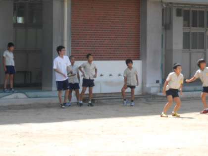今日から、教育実習を行うことになったU先生はさっそく休み時間は運動場でドッジボールです。子どもたちは大喜びです。