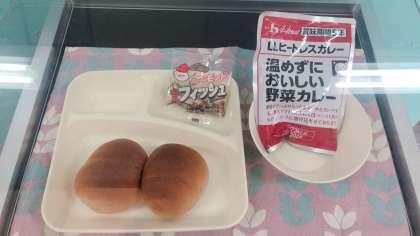 今日も臨時献立です。1/2黒糖ロールパン2個、ヒートレスカレー、アーモンドフィッシュ、牛乳です。いただきます。
