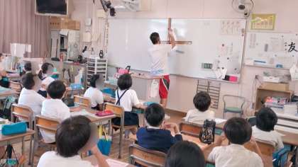 4年生の様子です。算数の図形の学習で、直角や平行などについてノートのヘリを使ったり白板に定規を置いて作ったりして、視覚的に捉えられるよう工夫していました。