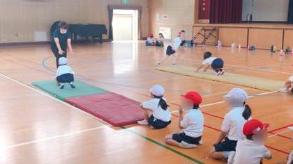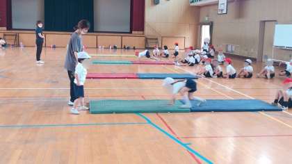 1年生の体育の様子です。マット運動あそびです。犬さんになったりウサギさんになったり動物真似っこで色々な動きをしています。