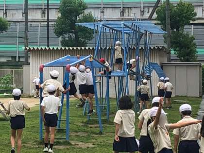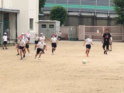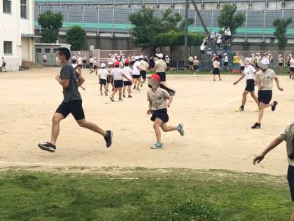 ここのところ休み時間に運動場が使えなかったので、今日はとても沢山の子たちが運動場で遊んでいます。先生も審判をしたり鬼ごっこに参加したり楽しんでいます。
