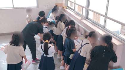 2年生の様子です。図工の学習で絵の具を使いました。後片付けでパレットをきれいに洗いうやり方を先生に教えてもらいました。とてもきれいに洗えていますね。