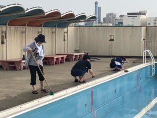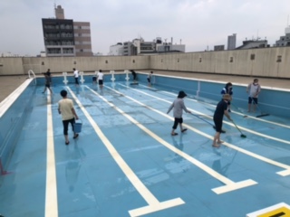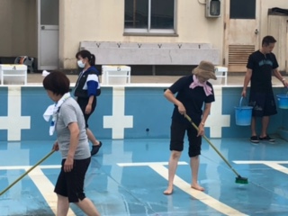 放課後、職員全員でプール清掃をしました。プール水槽は勿論、トイレや階段などの溜まった汚れをきれいに洗い流し、来週、気持ち良くプール水泳学習ができるよう準備ができました。