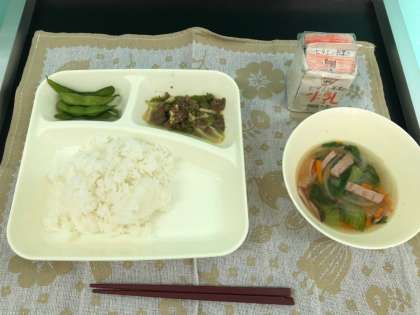 今日の献立は、チンジャオニューロースウ、ハムと野菜の中華スープ、枝豆、ご飯、牛乳です。しっかり食べて、午後からも元気に過ごせるようにしましょう。いただきます