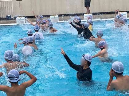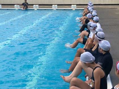 5年生のプール水泳学習の様子です。平泳ぎの足のかき方の練習をしていました。