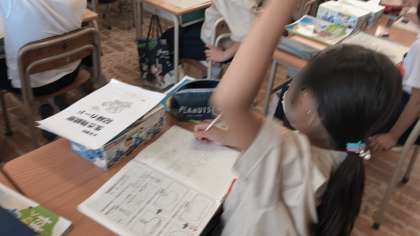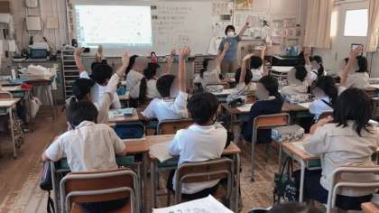 4年生の理科です。電流のはたらきの学習で、乾電池のつなぎ方について意見を発表していました。