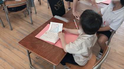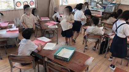 1年生の様子です。学習プリントの整理をしていました。係さんが○つけなどが終わったプリントを配り、それぞれで自分のファイルに綴じていきました。
