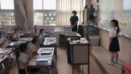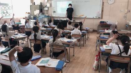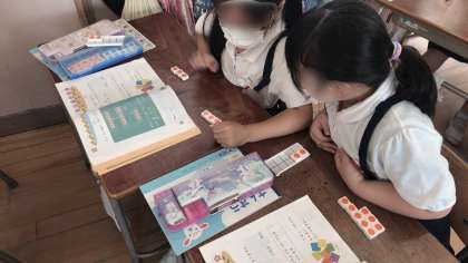 1年生の算数の様子です。引き算の学習で、「アメが8個ありました。3個食べました。残りは何個ですか?」の問題の考え方をブロックを使って隣の友だちに説明していました。また、前でみんなにも説明しました。