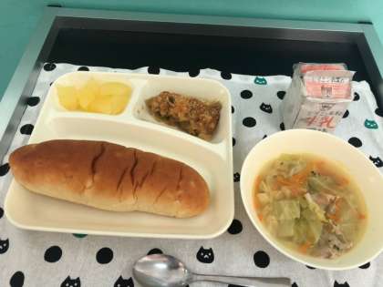 今日の献立は、カレードリア、豚肉とキャベツのスープ、りんご(カット缶)、おさつパン、牛乳です。いただきます。