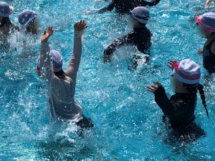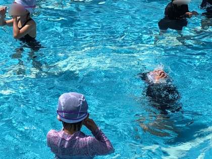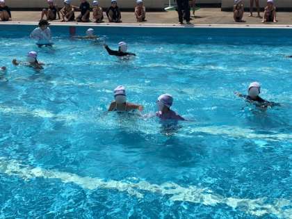 1・2年生のプール水泳学習の様子です。水の掛け合いをしたり水底にお尻をつけようと頑張ったり、水中駆け足をしたりしました。天気も良く楽しそうでした。