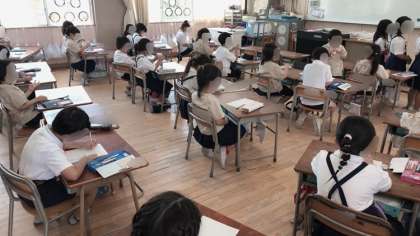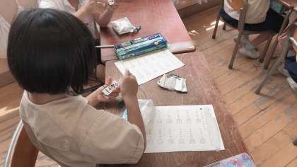 1年生の様子です。算数で足し算のプリントをしていました。計算カードをヒントに問題を解いている子もいました。プール水泳後で少し疲れているだろうけど頑張って!