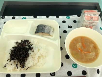 今日の献立は、さしごの塩焼き、味噌汁、牛ひじきそぼろ、ご飯、牛乳です。お昼からも元気に頑張れるよう、しっかりいただきましょう。