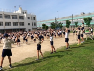 全校朝会でもラジオ体操をした後、校長や生活指導担当から熱中症への注意喚起を呼び掛けました。