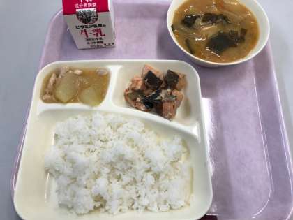 今日の献立は、鮭のつけ焼き、味噌汁、冬瓜の煮物、ご飯、牛乳です。いただきます。