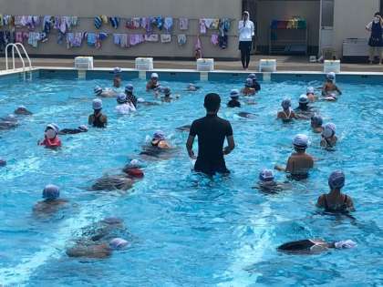 1・2年生のプール水泳学習の様子です。今日は「けのび」の練習をしました。体を真っ直ぐにして、潜水艦のように水中を進めるよう頑張っていました。