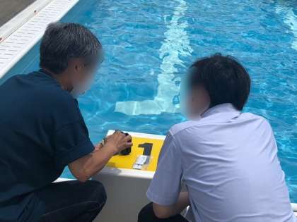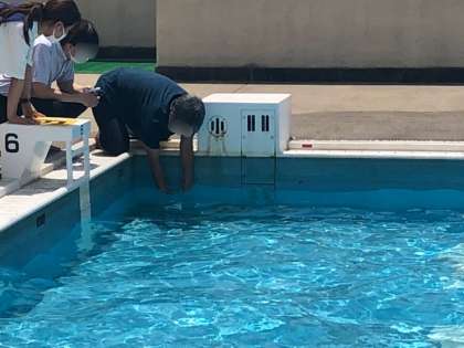 プール水泳学習期間中、本校薬剤師さんに定期的に詳しい水質検査をしていただいています。勿論本校職員が毎回検査していますが、専門家にも確かめていただいて、より安全にプール水泳学習が実施できるよう努めています。