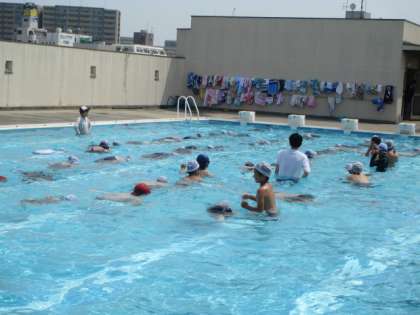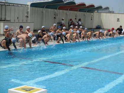 先頭を切って、5,6年生が入水しました。お天気も良く、水面がきらきらしています。